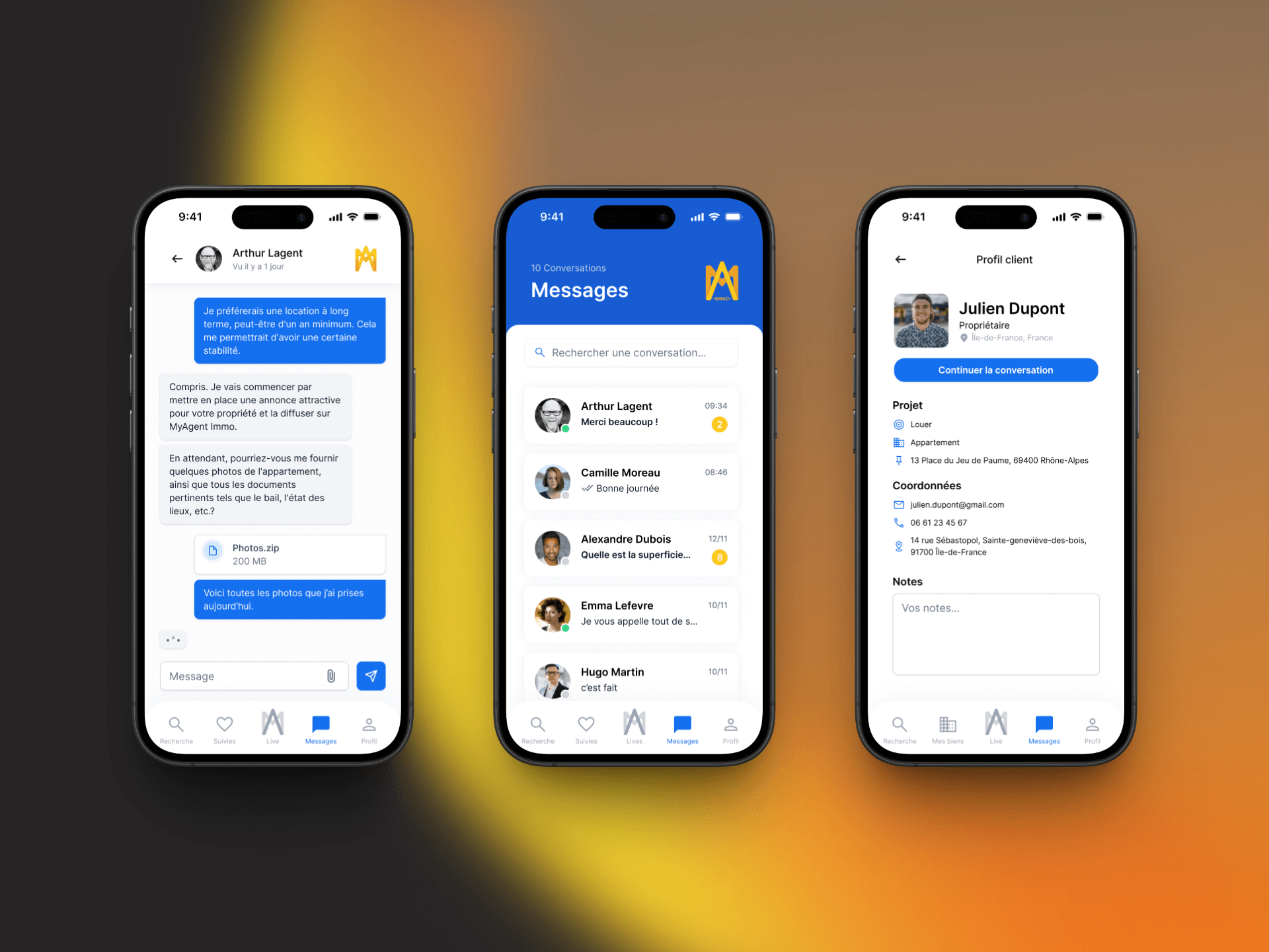 MyAgent Immo est né d’une vision ambitieuse : fluidifier et humaniser le marché immobilier grâce à une plateforme digitale innovante. Le projet consistait à créer un écosystème complet comprenant une application mobile pour iOS et Android, une version web, ainsi qu’un site vitrine pour asseoir sa notoriété. L’objectif était de connecter efficacement les agents immobiliers et les particuliers (vendeurs, acheteurs, locataires) via des outils modernes et intuitifs.